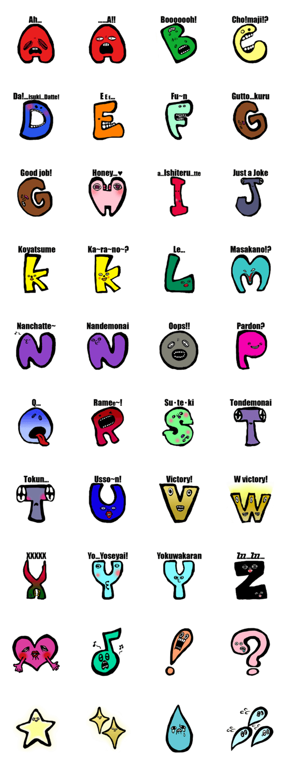 やなアルファベット 平間 コメントをどうぞ あれ!?この英語…読める!根はいいやつらなんです。なんとも言えない時に使っていただけたらと思います。 このスタンプどう思う?!↓クリックで投票♪好き (0)かわいい (0)かっこいい (0)おもしろい (0)使いやすそう (0)欲しい (0)萌え (0)ほっこりする (0)おしゃれ (0)ゆるい (0)こわい (0)ウザい (0)キモい (0)ムカつく (0)持ってる (0)癒される (0)セクシー (0)個性的 (0)私は買わない (0)誰かプレゼントして! (0) 購入・プレゼントする Facebookでシェア Twitterでシェア