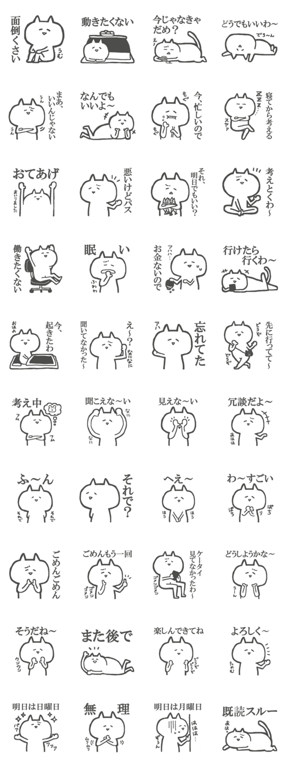 やる気の無い気持ちを伝える猫 CATHMO Inc. コメントをどうぞ ネガティブでやる気の無い日常の気持ちをダメなゆるねこが伝えます。 このスタンプどう思う?!↓クリックで投票♪好き (0)かわいい (0)かっこいい (0)おもしろい (0)使いやすそう (0)欲しい (0)萌え (0)ほっこりする (0)おしゃれ (0)ゆるい (0)こわい (0)ウザい (0)キモい (0)ムカつく (0)持ってる (0)癒される (0)セクシー (0)個性的 (0)私は買わない (0)誰かプレゼントして! (0) 購入・プレゼントする Facebookでシェア Twitterでシェア
