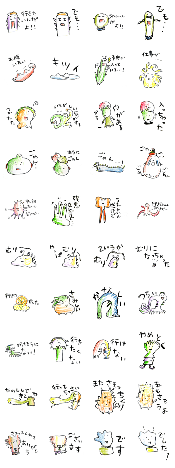 やわらかくお断りするスタンプ 加島綾乃 コメントをどうぞ 作者が食あたりになって、予定をキャンセルしなければならなくなったときに作りました。やわらかく断りたいときにぞうぞ。みなさんの申し訳ない気持ちが伝わりますように。 このスタンプどう思う?!↓クリックで投票♪好き (0)かわいい (0)かっこいい (0)おもしろい (0)使いやすそう (0)欲しい (0)萌え (0)ほっこりする (0)おしゃれ (0)ゆるい (0)こわい (0)ウザい (0)キモい (0)ムカつく (0)持ってる (0)癒される (0)セクシー (0)個性的 (0)私は買わない (0)誰かプレゼントして! (0) 購入・プレゼントする Facebookでシェア Twitterでシェア