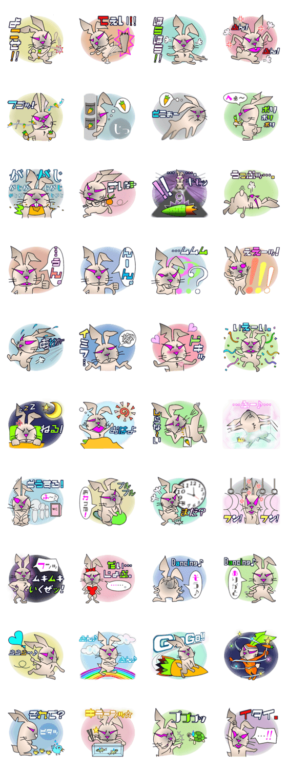 やんちゃウサギの「バットくん(悪兎君)」 tOmozo コメントをどうぞ 鋭い眼つきに荒い気性。楽しくたって笑顔は見せない。ニンジンのためならどこまでも。優しくないけど憎めない。奇想天外な行動、時々見せる可愛いしぐさ。その名はバット!! このスタンプどう思う?!↓クリックで投票♪好き (0)かわいい (0)かっこいい (0)おもしろい (0)使いやすそう (0)欲しい (0)萌え (0)ほっこりする (0)おしゃれ (0)ゆるい (0)こわい (0)ウザい (0)キモい (0)ムカつく (0)持ってる (0)癒される (0)セクシー (0)個性的 (0)私は買わない (0)誰かプレゼントして! (0) 購入・プレゼントする Facebookでシェア Twitterでシェア