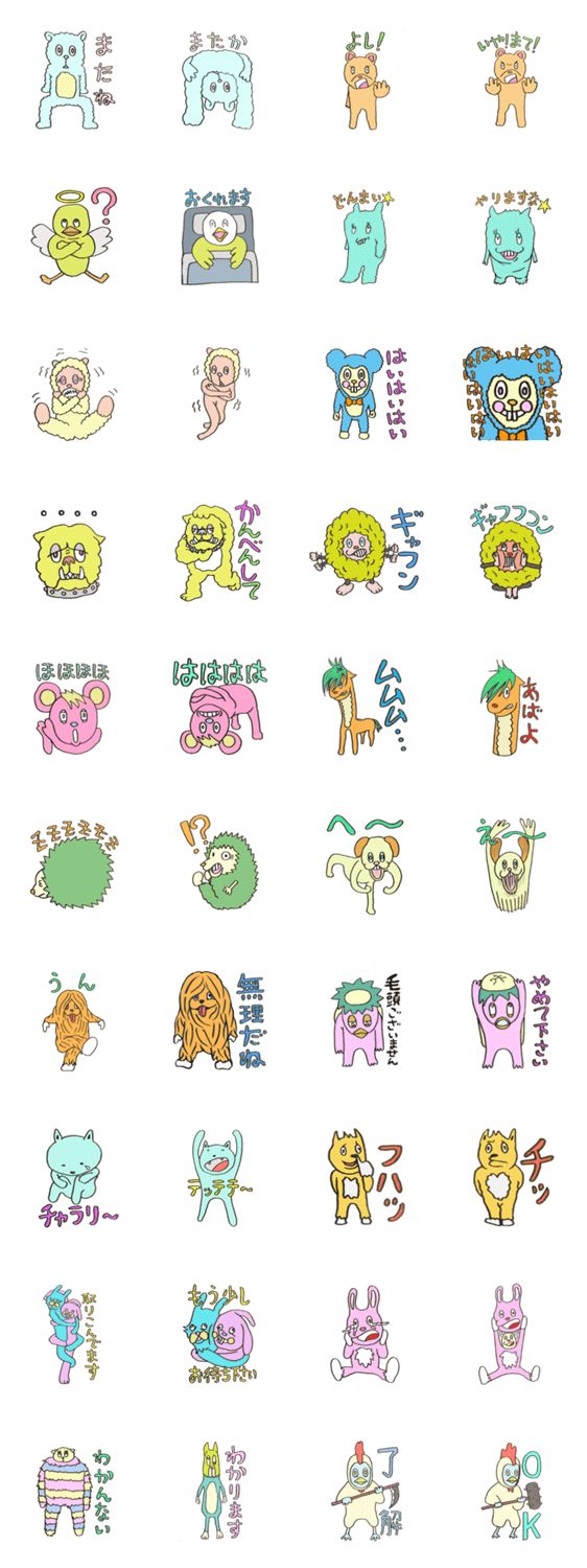 ゆかいなケモノたち noburn コメントをどうぞ 毛だらけのケモノたちが元気をくれたりくれなかったり このスタンプどう思う?!↓クリックで投票♪好き (0)かわいい (0)かっこいい (0)おもしろい (0)使いやすそう (0)欲しい (0)萌え (0)ほっこりする (0)おしゃれ (0)ゆるい (0)こわい (0)ウザい (0)キモい (0)ムカつく (0)持ってる (0)癒される (0)セクシー (0)個性的 (0)私は買わない (0)誰かプレゼントして! (0) 購入・プレゼントする Facebookでシェア Twitterでシェア