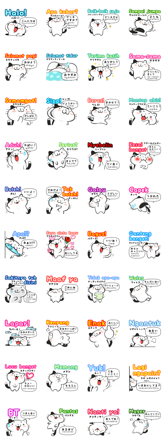 らくらくインドネシア語 前田ムサシ コメントをどうぞ インドネシア語と日本語の翻訳タイプのスタンプです。ふたつの国の基本的な挨拶や返事をそろえました。かわいい猫ちゃんと一緒にインドネシア語をらくらく楽しんでね! このスタンプどう思う?!↓クリックで投票♪好き (0)かわいい (0)かっこいい (0)おもしろい (0)使いやすそう (0)欲しい (0)萌え (0)ほっこりする (0)おしゃれ (0)ゆるい (0)こわい (0)ウザい (0)キモい (0)ムカつく (0)持ってる (0)癒される (0)セクシー (0)個性的 (0)私は買わない (0)誰かプレゼントして! (0) 購入・プレゼントする Facebookでシェア Twitterでシェア