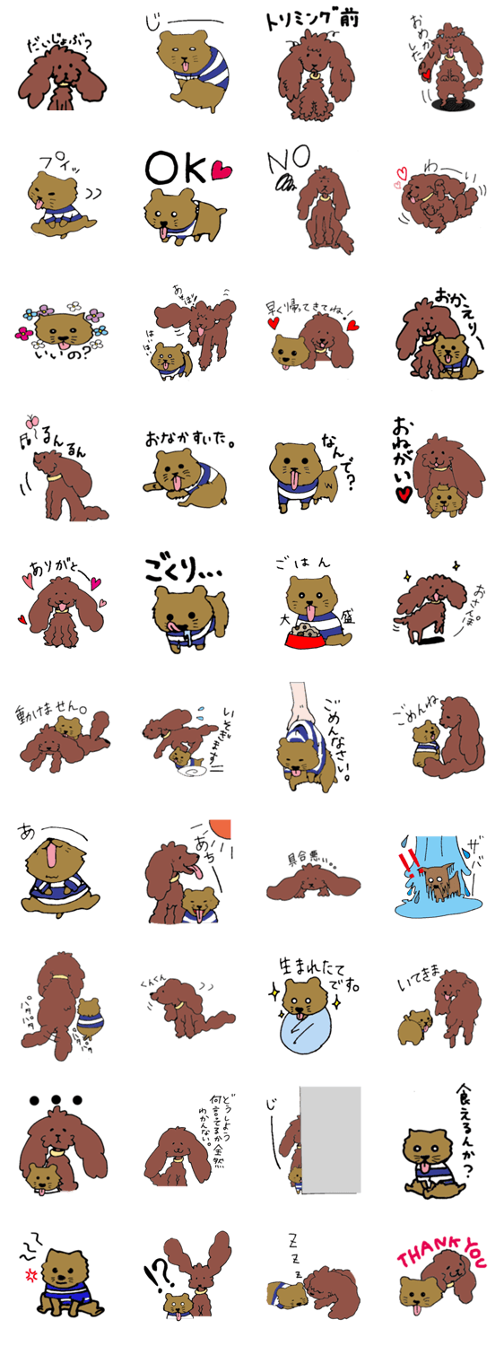 ろたさんとぼん taro コメントをどうぞ たぬきにしか見えないヨークシャテリアのろたさんと、いつもへらへらしているトイプードルのぼんのゆるい落書き風スタンプです。 このスタンプどう思う?!↓クリックで投票♪好き (0)かわいい (0)かっこいい (0)おもしろい (0)使いやすそう (0)欲しい (0)萌え (0)ほっこりする (0)おしゃれ (0)ゆるい (0)こわい (0)ウザい (0)キモい (0)ムカつく (0)持ってる (0)癒される (0)セクシー (0)個性的 (0)私は買わない (0)誰かプレゼントして! (0) 購入・プレゼントする Facebookでシェア Twitterでシェア