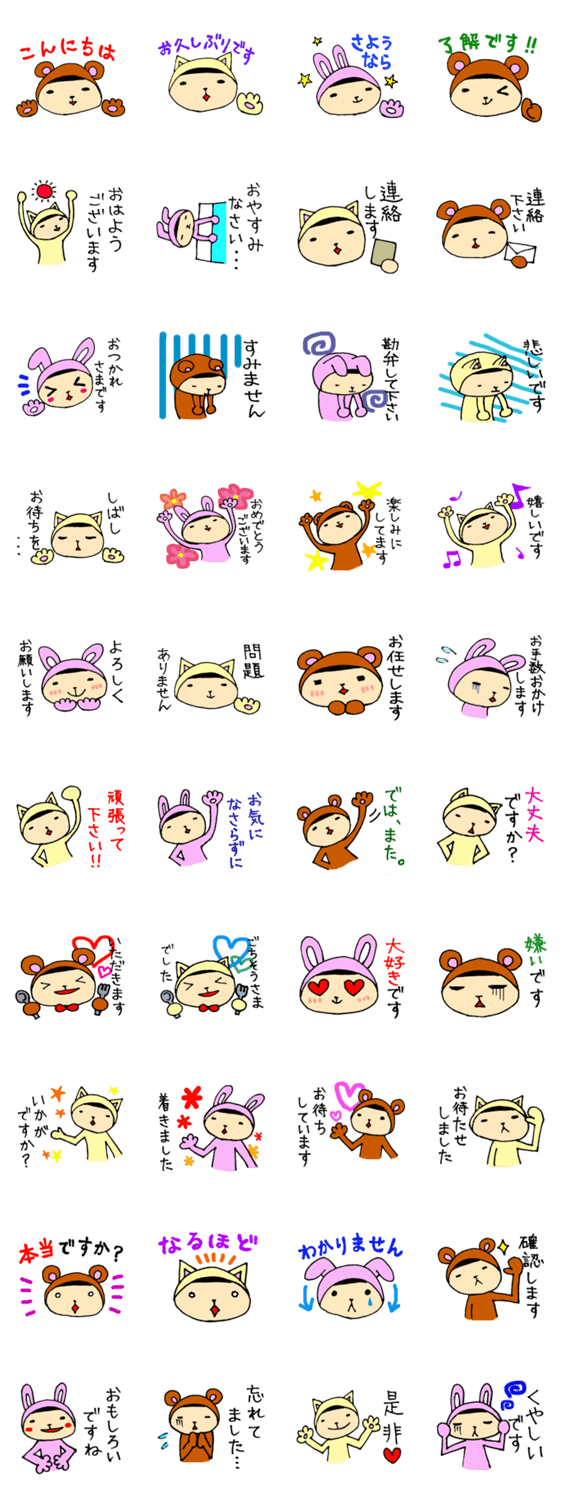 アニマル着ぐるみブラザーズ タケコ コメントをどうぞ 動物の着ぐるみを着た兄弟です。日常で使える敬語のスタンプです。 このスタンプどう思う?!↓クリックで投票♪好き (0)かわいい (0)かっこいい (0)おもしろい (0)使いやすそう (0)欲しい (0)萌え (0)ほっこりする (0)おしゃれ (0)ゆるい (0)こわい (0)ウザい (0)キモい (0)ムカつく (0)持ってる (0)癒される (0)セクシー (0)個性的 (0)私は買わない (0)誰かプレゼントして! (0) 購入・プレゼントする Facebookでシェア Twitterでシェア