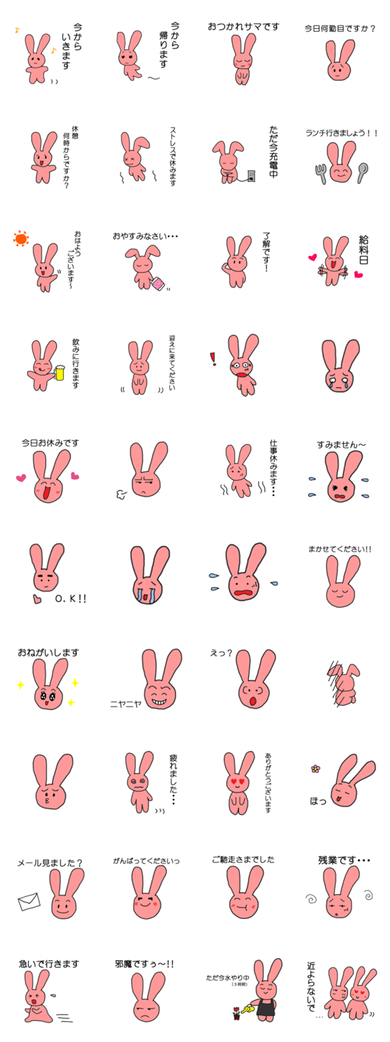 ウサギのうさこ Emi.K コメントをどうぞ 働く人が使えそうなスタンプを作ってみました。同僚、先輩と楽しく使ってくれたら嬉しいです。 このスタンプどう思う?!↓クリックで投票♪好き (0)かわいい (0)かっこいい (0)おもしろい (0)使いやすそう (0)欲しい (0)萌え (0)ほっこりする (0)おしゃれ (0)ゆるい (0)こわい (0)ウザい (0)キモい (0)ムカつく (0)持ってる (0)癒される (0)セクシー (0)個性的 (0)私は買わない (0)誰かプレゼントして! (0) 購入・プレゼントする Facebookでシェア Twitterでシェア