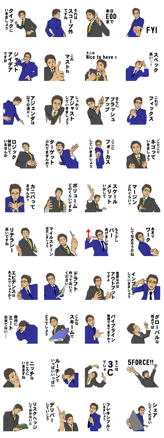 ウザリーマン高橋(仮)2 川西リョータ コメントをどうぞ ビジネスマンがつい使ってしまうカタカナ英語、コンサル用語、フレームワークを連発する、ちょっとウザいサラリーマン。外資系かベンチャーか?知的な貴方へ。第二弾! このスタンプどう思う?!↓クリックで投票♪好き (0)かわいい (0)かっこいい (0)おもしろい (0)使いやすそう (0)欲しい (0)萌え (0)ほっこりする (0)おしゃれ (0)ゆるい (0)こわい (0)ウザい (0)キモい (0)ムカつく (0)持ってる (0)癒される (0)セクシー (0)個性的 (0)私は買わない (0)誰かプレゼントして! (0) 購入・プレゼントする Facebookでシェア Twitterでシェア