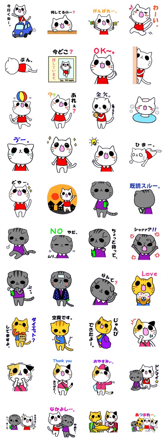 ウチのねこら。 aya コメントをどうぞ のうてんきな「しろくん」と、しっかり者の「みけちゃん」、ドーナツが大好きな「ちゃとらくん」、クールに見えて実は甘えん坊な「すこくん」の楽しい日常スタンプです。 このスタンプどう思う?!↓クリックで投票♪好き (0)かわいい (0)かっこいい (0)おもしろい (0)使いやすそう (0)欲しい (0)萌え (0)ほっこりする (0)おしゃれ (0)ゆるい (0)こわい (0)ウザい (0)キモい (0)ムカつく (0)持ってる (0)癒される (0)セクシー (0)個性的 (0)私は買わない (0)誰かプレゼントして! (0) 購入・プレゼントする Facebookでシェア Twitterでシェア