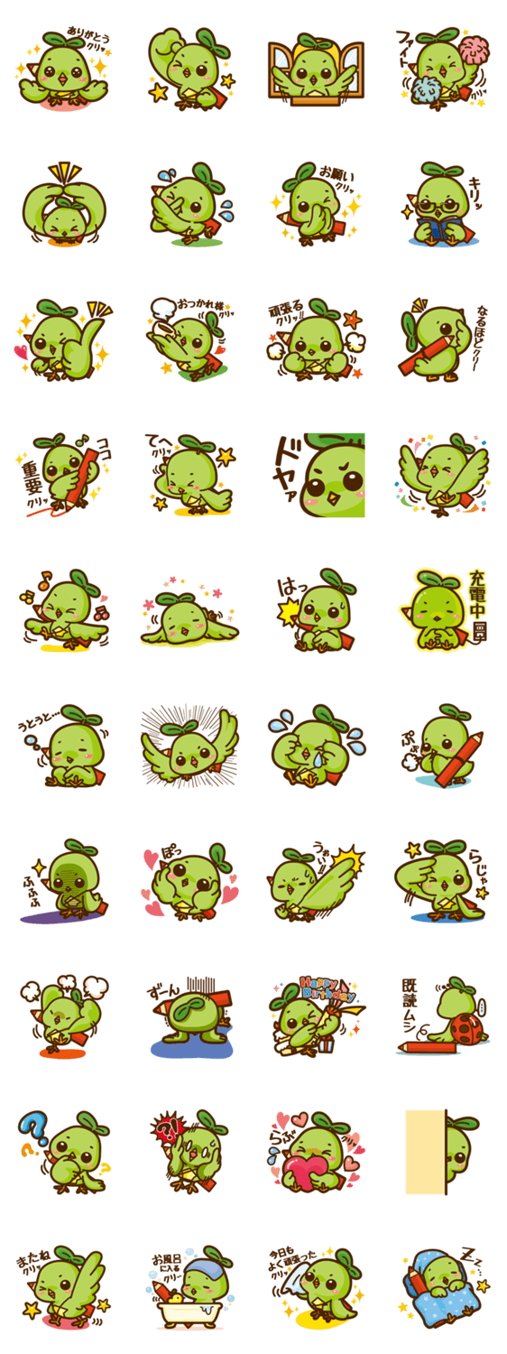 エフォール君 (株)エフォール コメントをどうぞ 幸せを呼ぶ青い鳥ならぬ「緑の鳥」クリッ!毎日が興奮と発見の繰り返しクリッ! このスタンプどう思う?!↓クリックで投票♪好き (0)かわいい (0)かっこいい (0)おもしろい (0)使いやすそう (0)欲しい (0)萌え (0)ほっこりする (0)おしゃれ (0)ゆるい (0)こわい (0)ウザい (0)キモい (0)ムカつく (0)持ってる (0)癒される (0)セクシー (0)個性的 (0)私は買わない (0)誰かプレゼントして! (0) 購入・プレゼントする Facebookでシェア Twitterでシェア