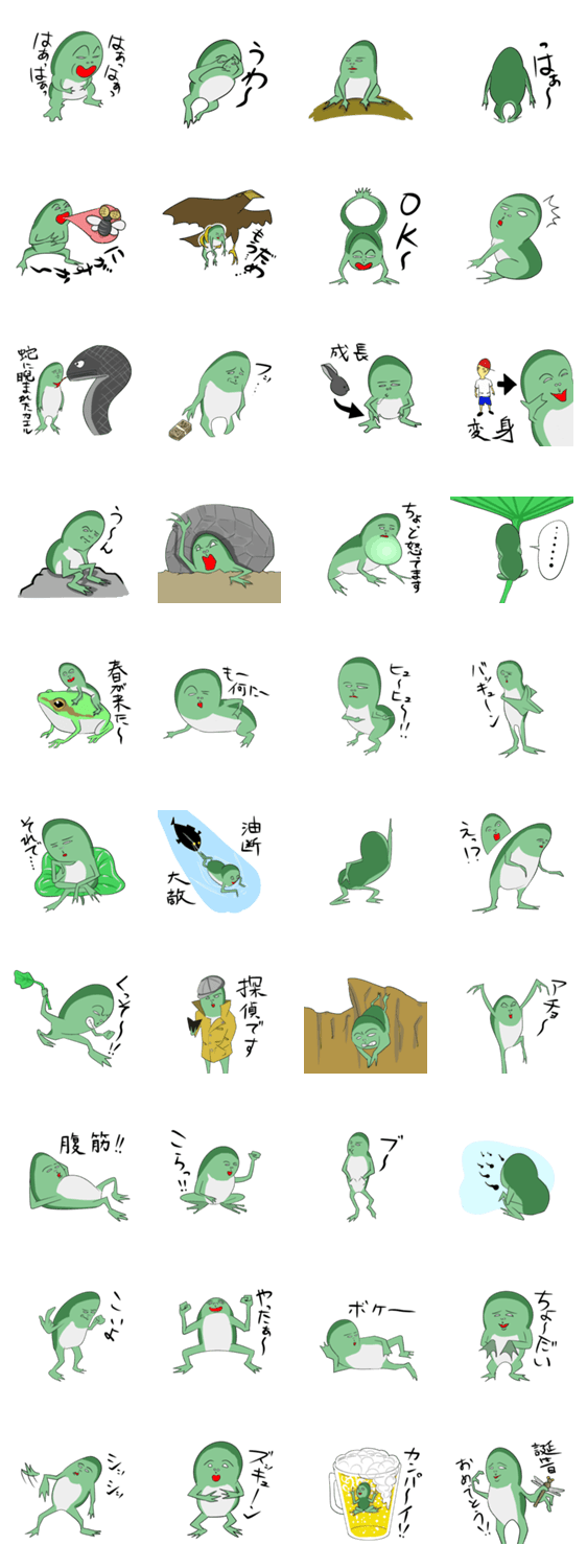 カエル小僧のひとこと Toyan コメントをどうぞ 小雨の降る日。蛙沼に行った少年が蛙に憑依。カエル小僧のシンプルなひとことです。 このスタンプどう思う?!↓クリックで投票♪好き (0)かわいい (0)かっこいい (0)おもしろい (0)使いやすそう (0)欲しい (0)萌え (0)ほっこりする (0)おしゃれ (0)ゆるい (0)こわい (0)ウザい (0)キモい (0)ムカつく (0)持ってる (0)癒される (0)セクシー (0)個性的 (0)私は買わない (0)誰かプレゼントして! (0) 購入・プレゼントする Facebookでシェア Twitterでシェア