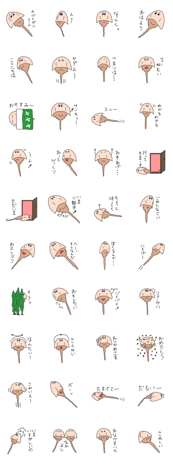 カブトガニさん Shimada,Ay コメントをどうぞ 生きた化石であるカブトガニさんをスタンプにしてみました。太古のロマンを感じつつ、おおいにご使用ください。 このスタンプどう思う?!↓クリックで投票♪好き (0)かわいい (0)かっこいい (0)おもしろい (0)使いやすそう (0)欲しい (0)萌え (0)ほっこりする (0)おしゃれ (0)ゆるい (0)こわい (0)ウザい (0)キモい (0)ムカつく (0)持ってる (0)癒される (0)セクシー (0)個性的 (0)私は買わない (0)誰かプレゼントして! (0) 購入・プレゼントする Facebookでシェア Twitterでシェア