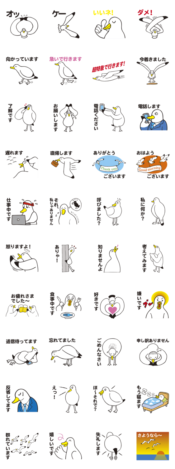 カモメのサラリーマン Bill コメントをどうぞ もしもカモメがサラリーマンだったら、そんなイメージでつくったスタンプです。 このスタンプどう思う?!↓クリックで投票♪好き (0)かわいい (0)かっこいい (0)おもしろい (0)使いやすそう (0)欲しい (0)萌え (0)ほっこりする (0)おしゃれ (0)ゆるい (0)こわい (0)ウザい (0)キモい (0)ムカつく (0)持ってる (0)癒される (0)セクシー (0)個性的 (0)私は買わない (0)誰かプレゼントして! (0) 購入・プレゼントする Facebookでシェア Twitterでシェア