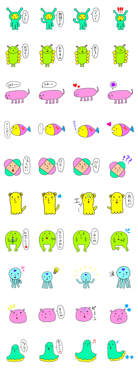 カラフルないきものたち miwa コメントをどうぞ 動物!?宇宙人!?なんだかわからないカラフルで不思議ないきものたちのスタンプです。 このスタンプどう思う?!↓クリックで投票♪好き (0)かわいい (0)かっこいい (0)おもしろい (0)使いやすそう (0)欲しい (0)萌え (0)ほっこりする (0)おしゃれ (0)ゆるい (0)こわい (0)ウザい (0)キモい (0)ムカつく (0)持ってる (0)癒される (0)セクシー (0)個性的 (0)私は買わない (0)誰かプレゼントして! (0) 購入・プレゼントする Facebookでシェア Twitterでシェア