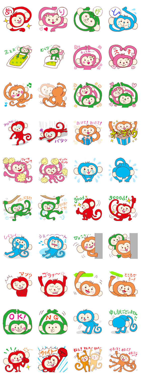 カラフルモンキーの連投スタンプ あやぱぐ コメントをどうぞ 5匹のカラフルモンキーによる、連投して楽しいツナガル・スタンプ!個性豊かなカラフモンキーが、楽しい事は2倍楽しく、気まづい事もユニークに代弁してくれます。 このスタンプどう思う?!↓クリックで投票♪好き (0)かわいい (0)かっこいい (0)おもしろい (0)使いやすそう (0)欲しい (0)萌え (0)ほっこりする (0)おしゃれ (0)ゆるい (0)こわい (0)ウザい (0)キモい (0)ムカつく (0)持ってる (0)癒される (0)セクシー (0)個性的 (0)私は買わない (0)誰かプレゼントして! (0) 購入・プレゼントする Facebookでシェア Twitterでシェア