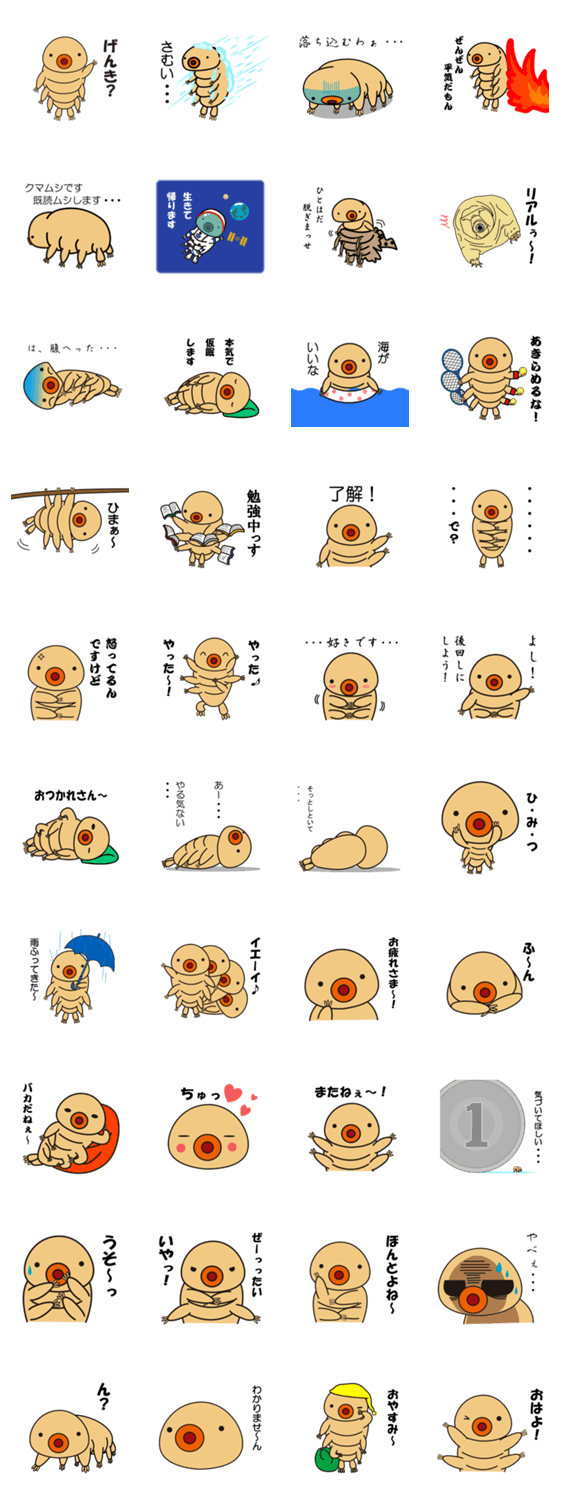 クマムシのくまたん えりりん コメントをどうぞ 緩歩動物クマムシの可愛いスタンプです。 このスタンプどう思う?!↓クリックで投票♪好き (0)かわいい (0)かっこいい (0)おもしろい (0)使いやすそう (0)欲しい (0)萌え (0)ほっこりする (0)おしゃれ (0)ゆるい (0)こわい (0)ウザい (0)キモい (0)ムカつく (0)持ってる (0)癒される (0)セクシー (0)個性的 (0)私は買わない (0)誰かプレゼントして! (0) 購入・プレゼントする Facebookでシェア Twitterでシェア