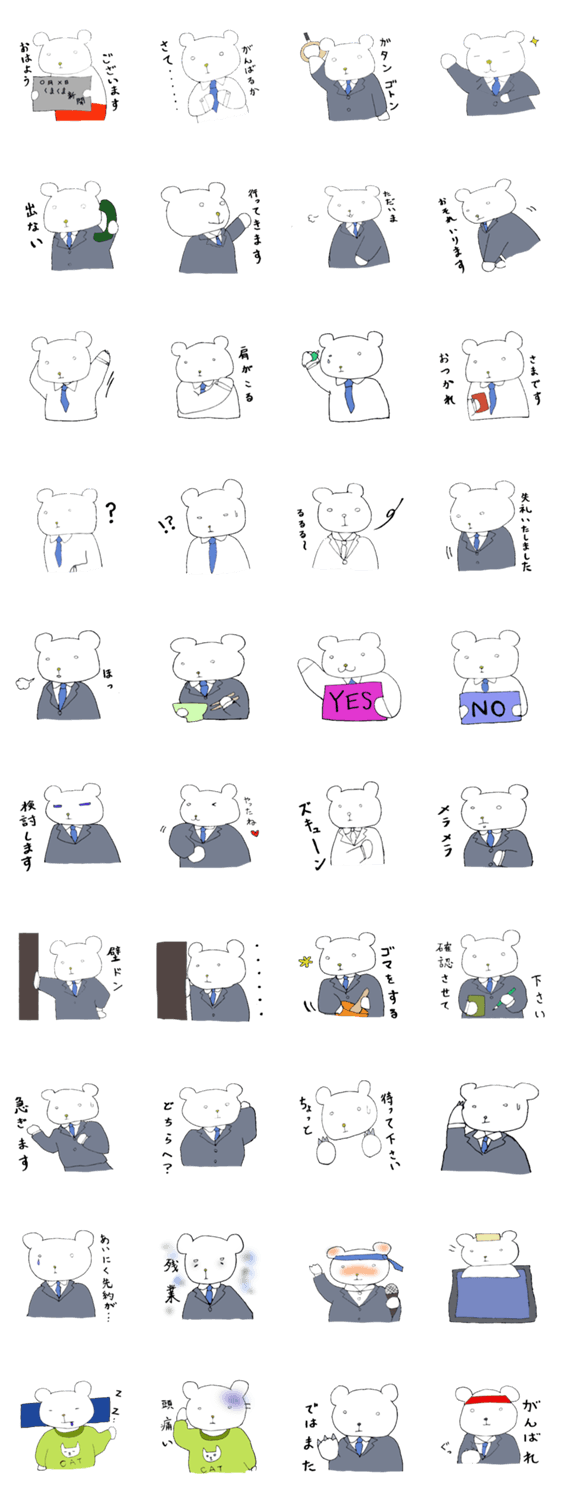 クマリーマンの日常。 枝豆ノンストップ コメントをどうぞ 「僕はクマ。今日もスーツを着て働くのです。」そんなクマリーマンの日常をスタンプにしてみました。 このスタンプどう思う?!↓クリックで投票♪好き (0)かわいい (0)かっこいい (0)おもしろい (0)使いやすそう (0)欲しい (0)萌え (0)ほっこりする (0)おしゃれ (0)ゆるい (0)こわい (0)ウザい (0)キモい (0)ムカつく (0)持ってる (0)癒される (0)セクシー (0)個性的 (0)私は買わない (0)誰かプレゼントして! (0) 購入・プレゼントする Facebookでシェア Twitterでシェア