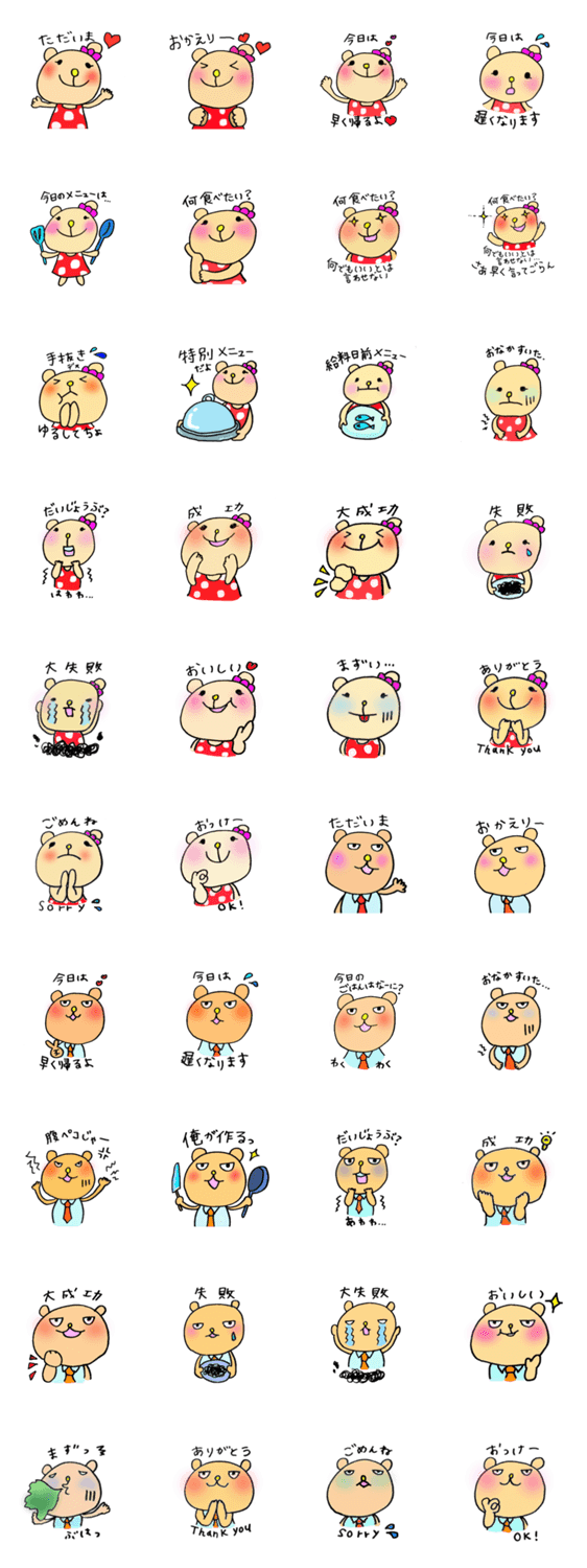 クマ太&クマ美 mana コメントをどうぞ 心はやさしいけど目つきが悪いクマ太と料理好きクマ美カップルの新婚生活。今日の帰りは?ごはんは?などなど、やりとりに使えるスタンプです。 このスタンプどう思う?!↓クリックで投票♪好き (0)かわいい (0)かっこいい (0)おもしろい (0)使いやすそう (0)欲しい (0)萌え (0)ほっこりする (0)おしゃれ (0)ゆるい (0)こわい (0)ウザい (0)キモい (0)ムカつく (0)持ってる (0)癒される (0)セクシー (0)個性的 (0)私は買わない (0)誰かプレゼントして! (0) 購入・プレゼントする Facebookでシェア Twitterでシェア