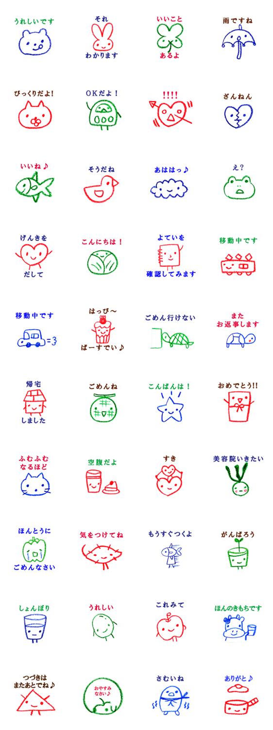 クレヨンスタンプ ようこ コメントをどうぞ クレヨンで絵を描きました。シンプルでスッキリ伝えたい方に。 このスタンプどう思う?!↓クリックで投票♪好き (0)かわいい (0)かっこいい (0)おもしろい (0)使いやすそう (0)欲しい (0)萌え (0)ほっこりする (0)おしゃれ (0)ゆるい (0)こわい (0)ウザい (0)キモい (0)ムカつく (0)持ってる (0)癒される (0)セクシー (0)個性的 (0)私は買わない (0)誰かプレゼントして! (0) 購入・プレゼントする Facebookでシェア Twitterでシェア