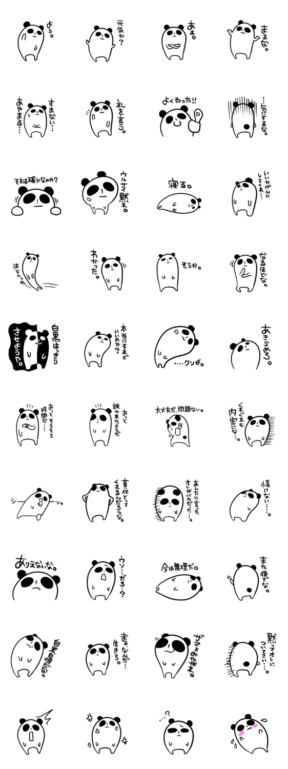 クールなパンダのダンダンさん。 Y's Studio コメントをどうぞ 謎の組織に所属していると噂のクールなパンダのダンダンさん。冷静・冷淡・コワモテ系?だけど、どこかかわいいパンダ。白黒シンプルで日常的にも使える便利なスタンプ! このスタンプどう思う?!↓クリックで投票♪好き (0)かわいい (0)かっこいい (0)おもしろい (0)使いやすそう (0)欲しい (0)萌え (0)ほっこりする (0)おしゃれ (0)ゆるい (0)こわい (0)ウザい (0)キモい (0)ムカつく (0)持ってる (0)癒される (0)セクシー (0)個性的 (0)私は買わない (0)誰かプレゼントして! (0) 購入・プレゼントする Facebookでシェア Twitterでシェア