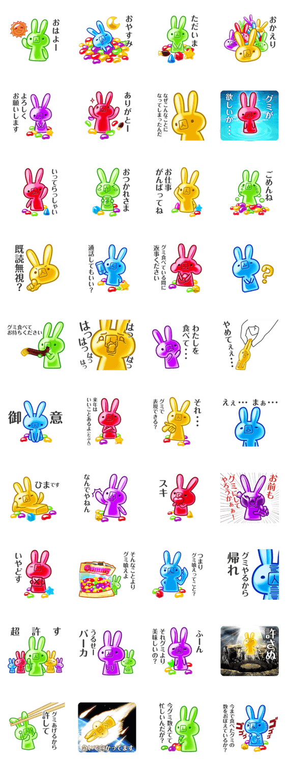 グミグミうさぎグミ はるましんじ・ナナマル コメントをどうぞ 煽り風味のウサギ型グミ詰め合わせ。噛めば噛むほど味が出てくる不思議でハードなスタンプです。友達とのトークに使ってね! このスタンプどう思う?!↓クリックで投票♪好き (0)かわいい (0)かっこいい (0)おもしろい (0)使いやすそう (0)欲しい (0)萌え (0)ほっこりする (0)おしゃれ (0)ゆるい (0)こわい (0)ウザい (0)キモい (0)ムカつく (0)持ってる (0)癒される (0)セクシー (0)個性的 (0)私は買わない (0)誰かプレゼントして! (0) 購入・プレゼントする Facebookでシェア Twitterでシェア
