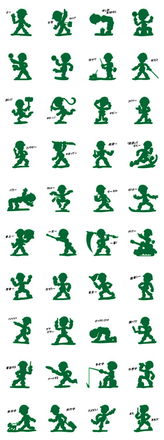 グリーンアーミー2(コップの淵の緑兵) tomoQ コメントをどうぞ 続クールなグリーンアーミーおもちゃキャラの人気スタンプ。ツッコミ、挨拶し、一発返信する、さらに汎用的でよく使うシチュエーションのメッセージやイラストも同梱。 このスタンプどう思う?!↓クリックで投票♪好き (0)かわいい (0)かっこいい (0)おもしろい (0)使いやすそう (0)欲しい (0)萌え (0)ほっこりする (0)おしゃれ (0)ゆるい (0)こわい (0)ウザい (0)キモい (0)ムカつく (0)持ってる (0)癒される (0)セクシー (0)個性的 (0)私は買わない (0)誰かプレゼントして! (0) 購入・プレゼントする Facebookでシェア Twitterでシェア