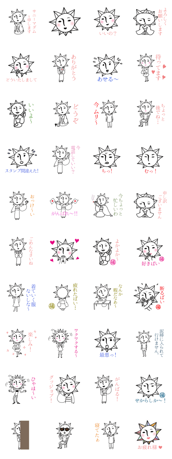 サニーマダム Ripple31 コメントをどうぞ おしとやかなサニーマダム。たまに陽気に踊ったりもしてしまう。福岡出身のサニーマダム。たまに福岡弁が出ます。いつもやさしいサニーマダム。でも切れると怖いよ。 このスタンプどう思う?!↓クリックで投票♪好き (0)かわいい (0)かっこいい (0)おもしろい (0)使いやすそう (0)欲しい (0)萌え (0)ほっこりする (0)おしゃれ (0)ゆるい (0)こわい (0)ウザい (0)キモい (0)ムカつく (0)持ってる (0)癒される (0)セクシー (0)個性的 (0)私は買わない (0)誰かプレゼントして! (0) 購入・プレゼントする Facebookでシェア Twitterでシェア