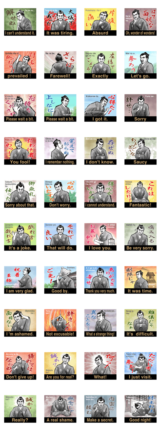サムライ・vol.1 コルト コメントをどうぞ 江戸時代、サムライのスタンプです。サムライ言葉で楽しんでください。 このスタンプどう思う?!↓クリックで投票♪好き (0)かわいい (0)かっこいい (0)おもしろい (0)使いやすそう (0)欲しい (0)萌え (0)ほっこりする (0)おしゃれ (0)ゆるい (0)こわい (0)ウザい (0)キモい (0)ムカつく (0)持ってる (0)癒される (0)セクシー (0)個性的 (0)私は買わない (0)誰かプレゼントして! (0) 購入・プレゼントする Facebookでシェア Twitterでシェア