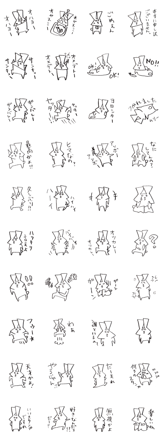 サンカクウサギ 宮永 松子 コメントをどうぞ 図形の三角とか数字の3や0でできたうさぎ。たまにハッキリ物を言う。好物は金時人参。背が低い事を気にしている。飼い主の渡辺さんの事は飼い主だと思っていない。 このスタンプどう思う?!↓クリックで投票♪好き (0)かわいい (0)かっこいい (0)おもしろい (0)使いやすそう (0)欲しい (0)萌え (0)ほっこりする (0)おしゃれ (0)ゆるい (0)こわい (0)ウザい (0)キモい (0)ムカつく (0)持ってる (0)癒される (0)セクシー (0)個性的 (0)私は買わない (0)誰かプレゼントして! (0) 購入・プレゼントする Facebookでシェア Twitterでシェア
