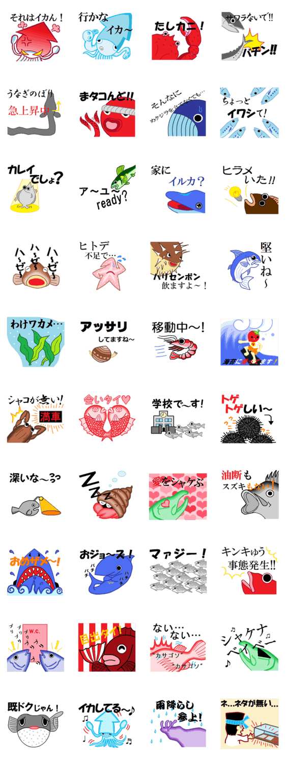シャレてる海の仲間たち! yoshitaka ikuta コメントをどうぞ 海の生物たちとダジャレのコラボレーション!普段の生活に使えるスタンプに仕上げました。 このスタンプどう思う?!↓クリックで投票♪好き (0)かわいい (0)かっこいい (0)おもしろい (0)使いやすそう (0)欲しい (0)萌え (0)ほっこりする (0)おしゃれ (0)ゆるい (0)こわい (0)ウザい (0)キモい (0)ムカつく (0)持ってる (0)癒される (0)セクシー (0)個性的 (0)私は買わない (0)誰かプレゼントして! (0) 購入・プレゼントする Facebookでシェア Twitterでシェア