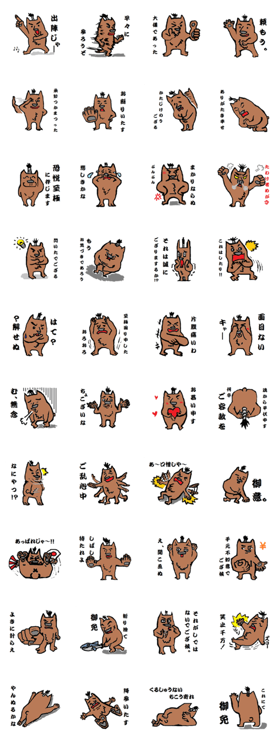 ジャパニーズ侍 熊兵衛 参上 ケンケン コメントをどうぞ ジャパニーズ侍 クマの熊兵衛参上。みんなで粋な侍語を使われよ。え、何言ってるかわかんないって?ま~雰囲気で何とか伝わるでござ候。 このスタンプどう思う?!↓クリックで投票♪好き (0)かわいい (0)かっこいい (0)おもしろい (0)使いやすそう (0)欲しい (0)萌え (0)ほっこりする (0)おしゃれ (0)ゆるい (0)こわい (0)ウザい (0)キモい (0)ムカつく (0)持ってる (0)癒される (0)セクシー (0)個性的 (0)私は買わない (0)誰かプレゼントして! (0) 購入・プレゼントする Facebookでシェア Twitterでシェア