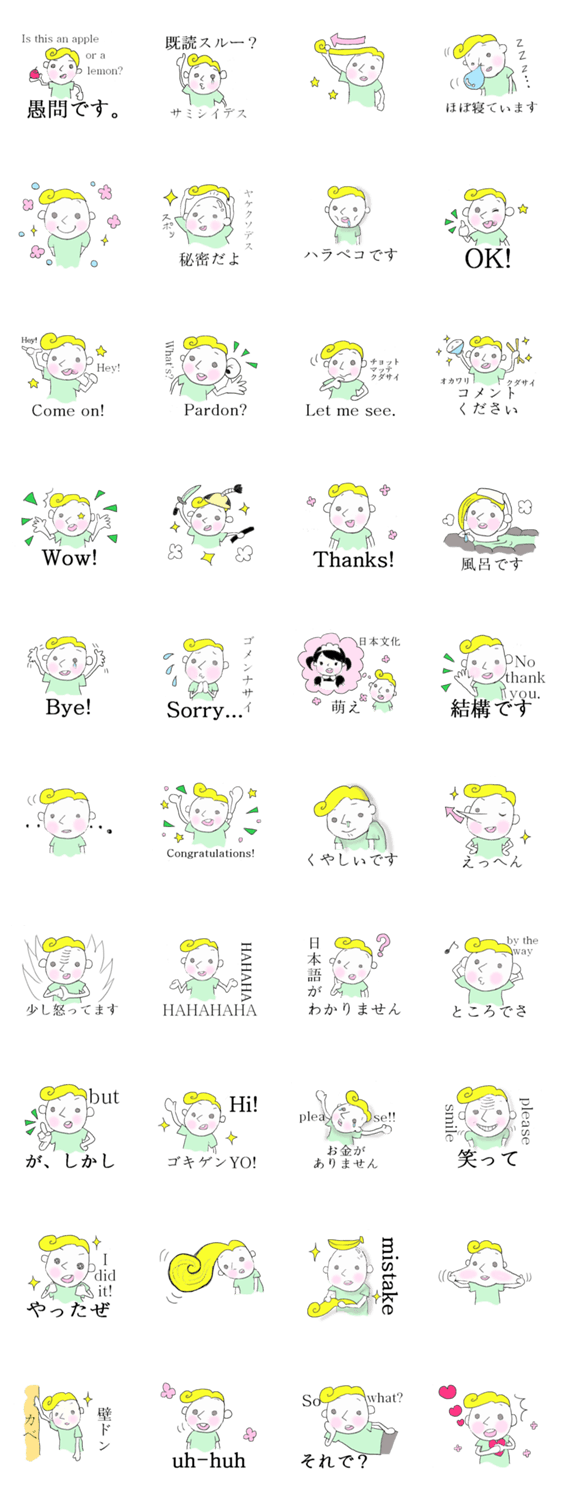 ジョン、言いにくいことも言っちゃうよ。 かよじゃが コメントをどうぞ ジョンは日本語が得意ではない男の子です。日本人ならためらうことも、サクッと言っちゃいます。 このスタンプどう思う?!↓クリックで投票♪好き (0)かわいい (0)かっこいい (0)おもしろい (0)使いやすそう (0)欲しい (0)萌え (0)ほっこりする (0)おしゃれ (0)ゆるい (0)こわい (0)ウザい (0)キモい (0)ムカつく (0)持ってる (0)癒される (0)セクシー (0)個性的 (0)私は買わない (0)誰かプレゼントして! (0) 購入・プレゼントする Facebookでシェア Twitterでシェア