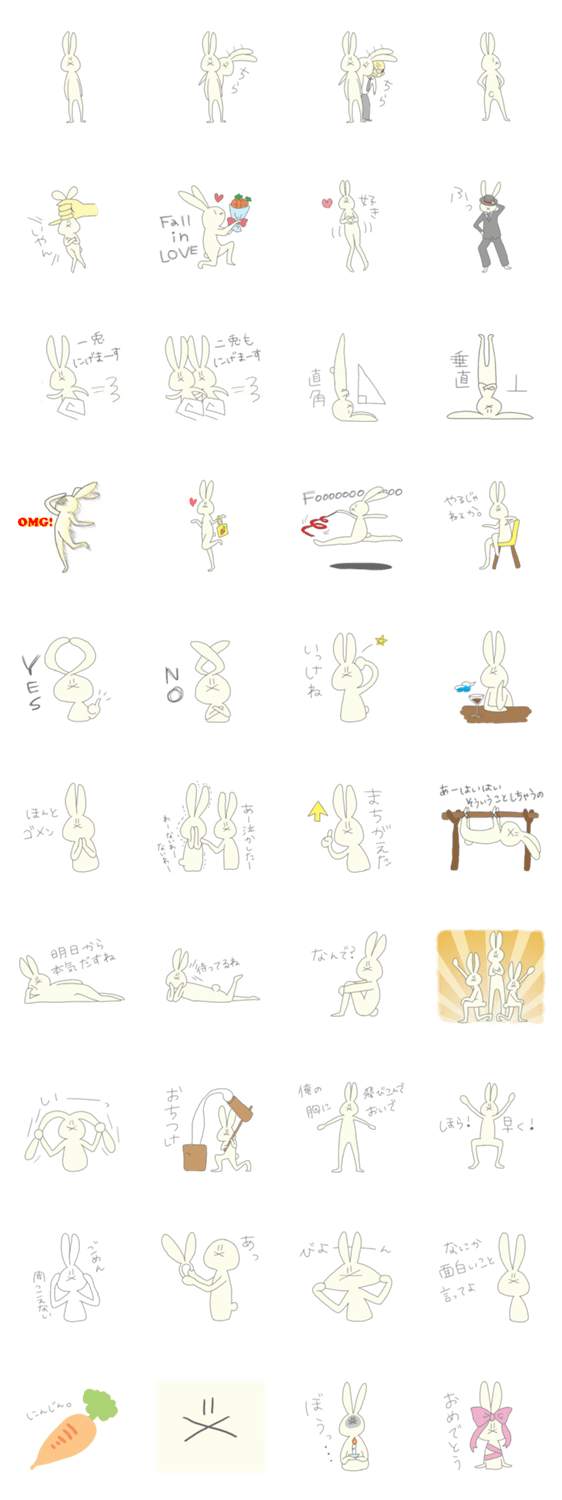 スタイリッシュうさぎ honami コメントをどうぞ ひとつ、表情一つも変えず。ふたつ、ふざけたその動き。みっつ、耳より長い脚。人呼んで「スタイリッシュうさぎ」!!キモカワでシュールな世界観にあなたもトリコ!?☆ このスタンプどう思う?!↓クリックで投票♪好き (0)かわいい (0)かっこいい (0)おもしろい (0)使いやすそう (0)欲しい (0)萌え (0)ほっこりする (0)おしゃれ (0)ゆるい (0)こわい (0)ウザい (0)キモい (0)ムカつく (0)持ってる (0)癒される (0)セクシー (0)個性的 (0)私は買わない (0)誰かプレゼントして! (0) 購入・プレゼントする Facebookでシェア Twitterでシェア