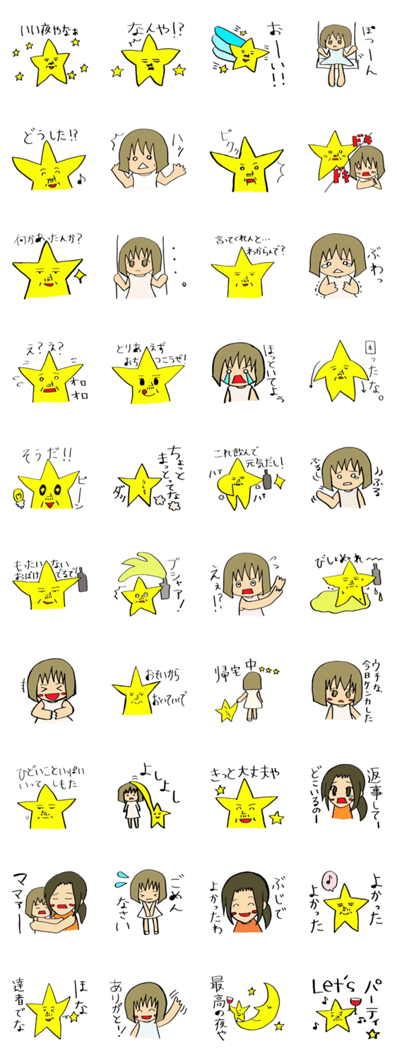 スターおじさんと少女の物語 よっぱげ コメントをどうぞ 星のおじさんと家出少女の、ドタバタ物語。1つ1つ使ってもよし、暇な相手に40個順番に連投してもよし。組み合わせによってはオリジナルストーリーが出来ちゃうかも!? このスタンプどう思う?!↓クリックで投票♪好き (0)かわいい (0)かっこいい (0)おもしろい (0)使いやすそう (0)欲しい (0)萌え (0)ほっこりする (0)おしゃれ (0)ゆるい (0)こわい (0)ウザい (0)キモい (0)ムカつく (0)持ってる (0)癒される (0)セクシー (0)個性的 (0)私は買わない (0)誰かプレゼントして! (0) 購入・プレゼントする Facebookでシェア Twitterでシェア