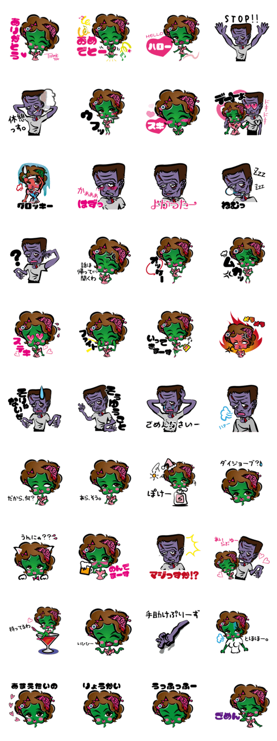 ソンビ娘とフランケンシュタイン MARILYN MASASON コメントをどうぞ ゾンビ娘とフランケンシュタインのホラーカップル。二人の日常会話をスタンプにしました。ちょっとホラーで、ダークだけどとっても可愛い!二人は無敵の最強コンビよ! このスタンプどう思う?!↓クリックで投票♪好き (0)かわいい (0)かっこいい (0)おもしろい (0)使いやすそう (0)欲しい (0)萌え (0)ほっこりする (0)おしゃれ (0)ゆるい (0)こわい (0)ウザい (0)キモい (0)ムカつく (0)持ってる (0)癒される (0)セクシー (0)個性的 (0)私は買わない (0)誰かプレゼントして! (0) 購入・プレゼントする Facebookでシェア Twitterでシェア