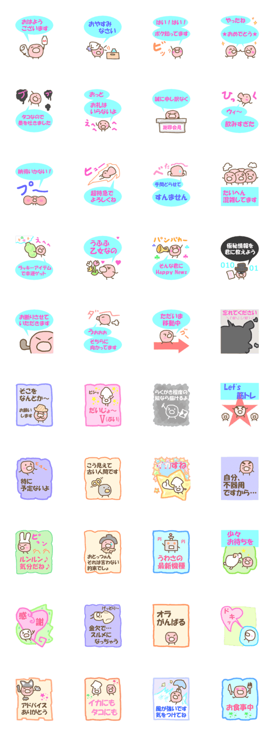 タコすけは今日もがんばる 宇宙ニワトリ コメントをどうぞ 不思議な生き物タコすけのほのぼのスタンプです。 このスタンプどう思う?!↓クリックで投票♪好き (0)かわいい (0)かっこいい (0)おもしろい (0)使いやすそう (0)欲しい (0)萌え (0)ほっこりする (0)おしゃれ (0)ゆるい (0)こわい (0)ウザい (0)キモい (0)ムカつく (0)持ってる (0)癒される (0)セクシー (0)個性的 (0)私は買わない (0)誰かプレゼントして! (0) 購入・プレゼントする Facebookでシェア Twitterでシェア