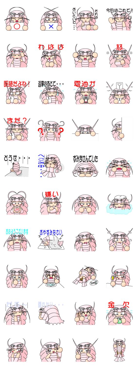 ダイオウグソクムシのクーたん ボンちゃん コメントをどうぞ ダイオウグソクムシ少女、クーたんの日常をスタンプでお楽しみください このスタンプどう思う?!↓クリックで投票♪好き (0)かわいい (0)かっこいい (0)おもしろい (0)使いやすそう (0)欲しい (0)萌え (0)ほっこりする (0)おしゃれ (0)ゆるい (0)こわい (0)ウザい (0)キモい (0)ムカつく (0)持ってる (0)癒される (0)セクシー (0)個性的 (0)私は買わない (0)誰かプレゼントして! (0) 購入・プレゼントする Facebookでシェア Twitterでシェア