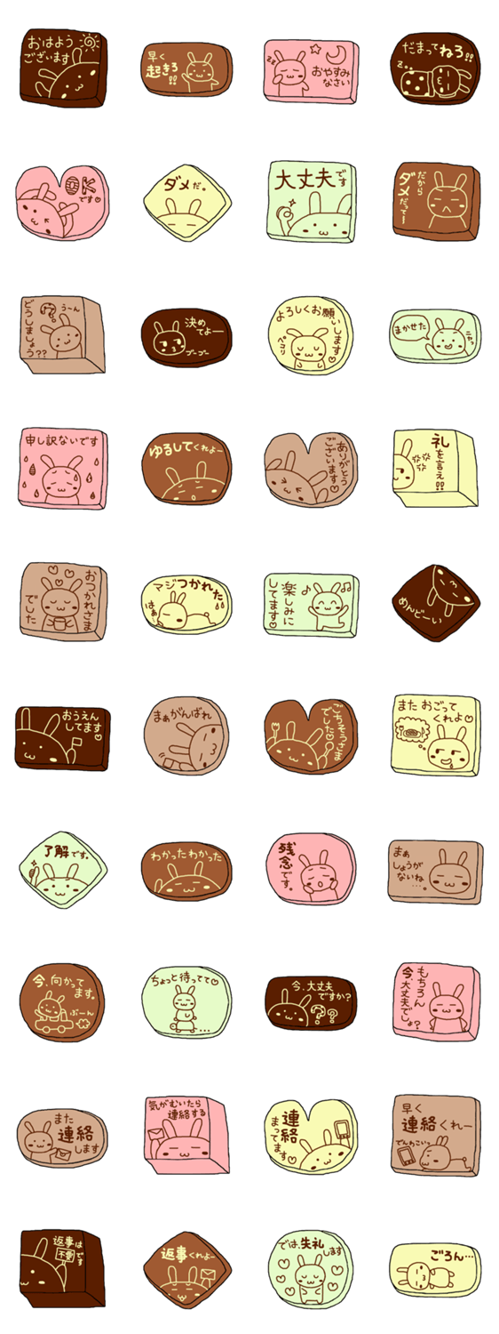 チョコレートにお絵描き2 敬語&心の声 あべ よしこ コメントをどうぞ チョコレートにお絵描きの第2弾。今回は敬語と心の声。丁寧にしゃべるウサギだが、実は心の中ではこんな事を思っています。そんなスタンプを是非使ってみてください。 このスタンプどう思う?!↓クリックで投票♪好き (0)かわいい (0)かっこいい (0)おもしろい (0)使いやすそう (0)欲しい (0)萌え (0)ほっこりする (0)おしゃれ (0)ゆるい (0)こわい (0)ウザい (0)キモい (0)ムカつく (0)持ってる (0)癒される (0)セクシー (0)個性的 (0)私は買わない (0)誰かプレゼントして! (0) 購入・プレゼントする Facebookでシェア Twitterでシェア
