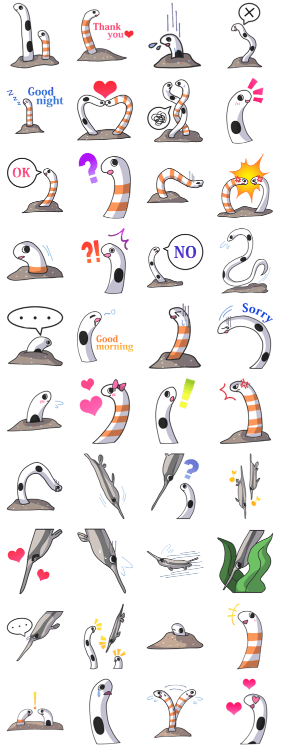 チンアナゴ・ニシキアナゴ・ヘコアユ ぽんず コメントをどうぞ 水族館で大人気のちょっと変わったお魚さんたち、チンアナゴ・ニシキアナゴ・ヘコアユのスタンプです! このスタンプどう思う?!↓クリックで投票♪好き (0)かわいい (0)かっこいい (0)おもしろい (0)使いやすそう (0)欲しい (0)萌え (0)ほっこりする (0)おしゃれ (0)ゆるい (0)こわい (0)ウザい (0)キモい (0)ムカつく (0)持ってる (0)癒される (0)セクシー (0)個性的 (0)私は買わない (0)誰かプレゼントして! (0) 購入・プレゼントする Facebookでシェア Twitterでシェア