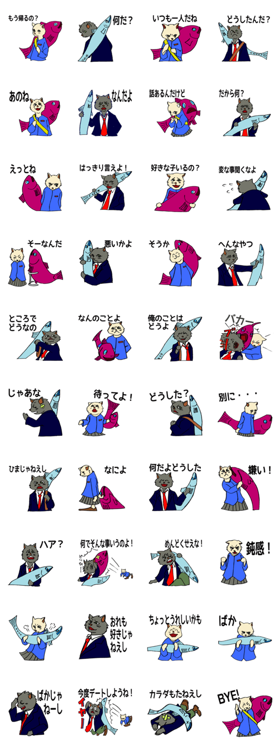 ツンデレ猫ちゃん魚を投げた! はばねろちゃん コメントをどうぞ お互い好き同士の猫ちゃんたちだが、正直になれなくてつい魚を相手に投げてしまいます。恋の行方は?鯉でなくて金魚と秋刀魚ですから。 このスタンプどう思う?!↓クリックで投票♪好き (0)かわいい (0)かっこいい (0)おもしろい (0)使いやすそう (0)欲しい (0)萌え (0)ほっこりする (0)おしゃれ (0)ゆるい (0)こわい (0)ウザい (0)キモい (0)ムカつく (0)持ってる (0)癒される (0)セクシー (0)個性的 (0)私は買わない (0)誰かプレゼントして! (0) 購入・プレゼントする Facebookでシェア Twitterでシェア
