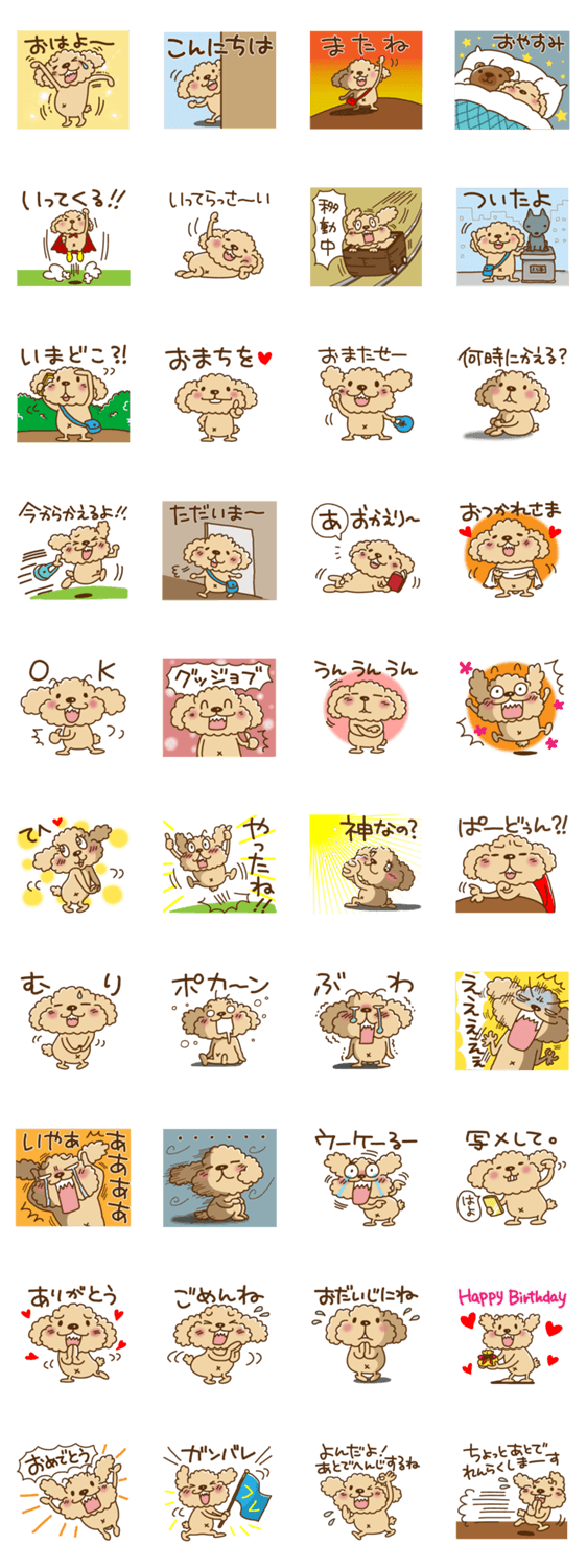 トイプーのぷう太郎 基本ごあいさつセット satoco コメントをどうぞ ぷう太郎スタンプの番外編。今回はよく使う基本のご挨拶をギュッとまとめました。これさえあればとりあえず困らない便利スタンプセットです。 このスタンプどう思う?!↓クリックで投票♪好き (0)かわいい (0)かっこいい (0)おもしろい (0)使いやすそう (0)欲しい (0)萌え (0)ほっこりする (0)おしゃれ (0)ゆるい (0)こわい (0)ウザい (0)キモい (0)ムカつく (0)持ってる (0)癒される (0)セクシー (0)個性的 (0)私は買わない (0)誰かプレゼントして! (0) 購入・プレゼントする Facebookでシェア Twitterでシェア