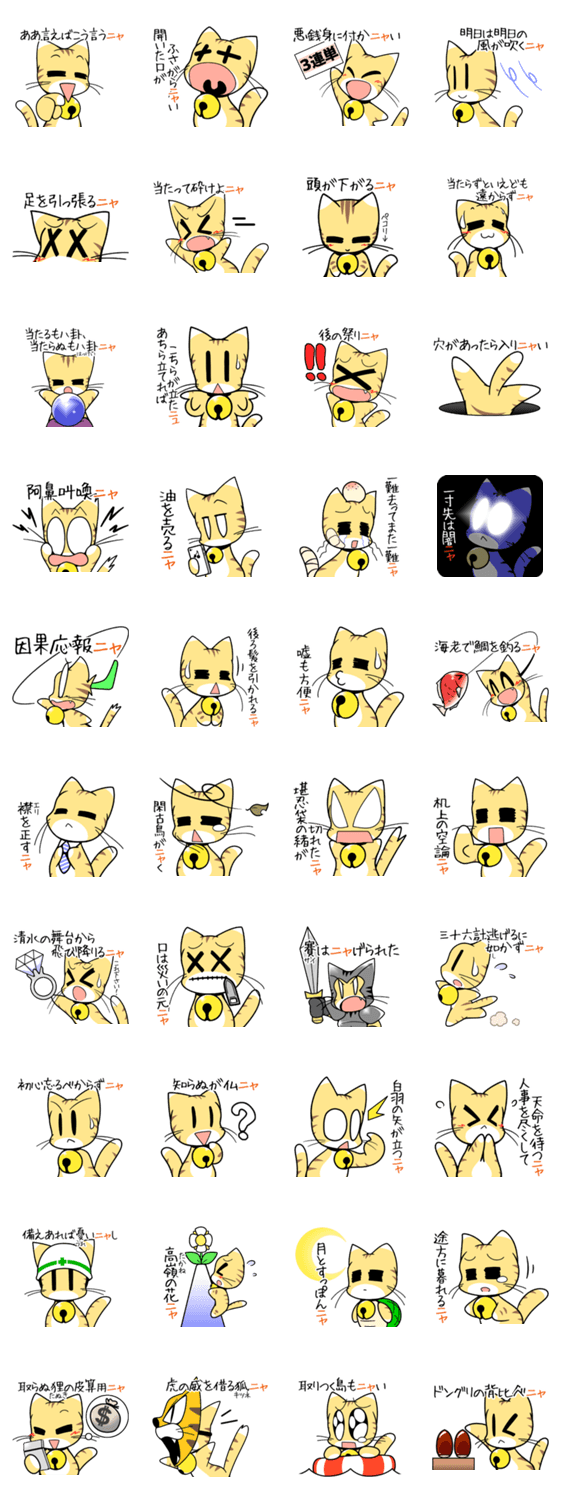 ニャン太のことわざニャンダフル2 あ~た行 小次郎 コメントをどうぞ ニャン太のことわざ第二弾です。日常での使用頻度の高いあ行~た行までの故事ことわざをまとめました。ニャン太くんフルスロットル! このスタンプどう思う?!↓クリックで投票♪好き (0)かわいい (0)かっこいい (0)おもしろい (0)使いやすそう (0)欲しい (0)萌え (0)ほっこりする (0)おしゃれ (0)ゆるい (0)こわい (0)ウザい (0)キモい (0)ムカつく (0)持ってる (0)癒される (0)セクシー (0)個性的 (0)私は買わない (0)誰かプレゼントして! (0) 購入・プレゼントする Facebookでシェア Twitterでシェア