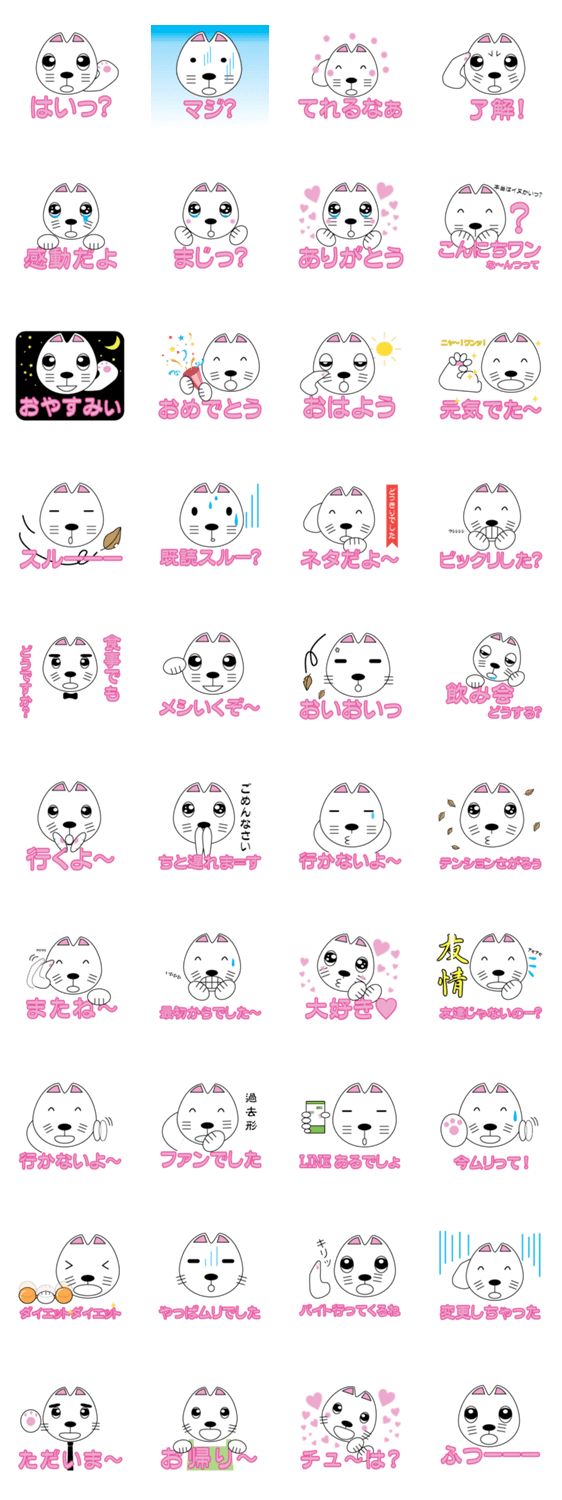 ニャーワン Kinjo Mayumi コメントをどうぞ ネコイヌどちらも描けない作者が空想で作ったネコとイヌのハーフです。気軽にお使いください。 このスタンプどう思う?!↓クリックで投票♪好き (0)かわいい (0)かっこいい (0)おもしろい (0)使いやすそう (0)欲しい (0)萌え (0)ほっこりする (0)おしゃれ (0)ゆるい (0)こわい (0)ウザい (0)キモい (0)ムカつく (0)持ってる (0)癒される (0)セクシー (0)個性的 (0)私は買わない (0)誰かプレゼントして! (0) 購入・プレゼントする Facebookでシェア Twitterでシェア