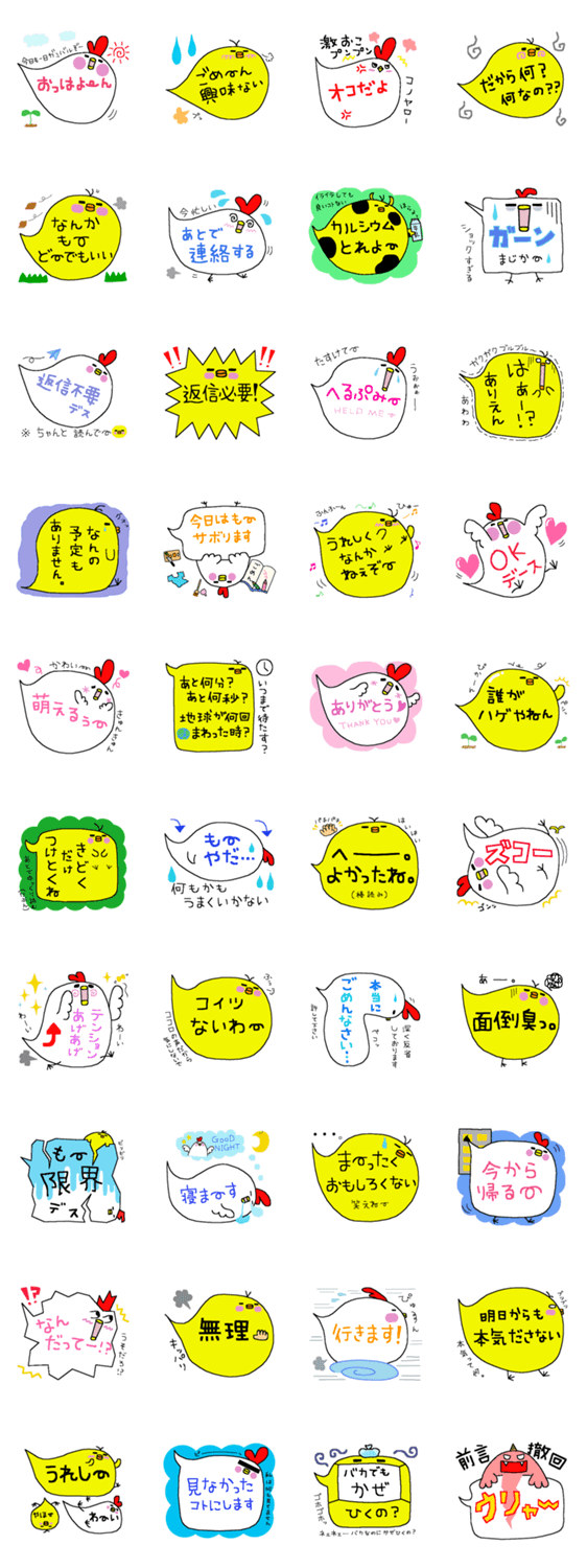 ニワトリとヒヨコ吹き出しバージョン ちょる コメントをどうぞ ニワトリとヒヨコ第3弾は吹き出しバージョン!ちらほら見え隠れするヒヨコのダークな一面に注目!! このスタンプどう思う?!↓クリックで投票♪好き (0)かわいい (0)かっこいい (0)おもしろい (0)使いやすそう (0)欲しい (0)萌え (0)ほっこりする (0)おしゃれ (0)ゆるい (0)こわい (0)ウザい (0)キモい (0)ムカつく (0)持ってる (0)癒される (0)セクシー (0)個性的 (0)私は買わない (0)誰かプレゼントして! (0) 購入・プレゼントする Facebookでシェア Twitterでシェア