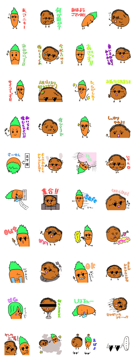 ニンジン君とジャガイモ君 nyanta コメントをどうぞ 不良化したニンジン君とジャガイモ君のスタンプです。 このスタンプどう思う?!↓クリックで投票♪好き (0)かわいい (0)かっこいい (0)おもしろい (0)使いやすそう (0)欲しい (0)萌え (0)ほっこりする (0)おしゃれ (0)ゆるい (0)こわい (0)ウザい (0)キモい (0)ムカつく (0)持ってる (0)癒される (0)セクシー (0)個性的 (0)私は買わない (0)誰かプレゼントして! (0) 購入・プレゼントする Facebookでシェア Twitterでシェア