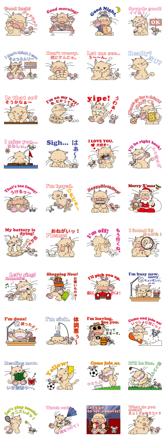 ノエルとチュチュはいつも一緒。 シライ キヨシ コメントをどうぞ 猫のノエルとねずみのチュチュはいつも一緒の仲良しちゃん。日常よくあるシーンに英語と日本語のメッセージが付いているので、海外のお友達とのやり取りにも便利です。 このスタンプどう思う?!↓クリックで投票♪好き (0)かわいい (0)かっこいい (0)おもしろい (0)使いやすそう (0)欲しい (0)萌え (0)ほっこりする (0)おしゃれ (0)ゆるい (0)こわい (0)ウザい (0)キモい (0)ムカつく (0)持ってる (0)癒される (0)セクシー (0)個性的 (0)私は買わない (0)誰かプレゼントして! (0) 購入・プレゼントする Facebookでシェア Twitterでシェア