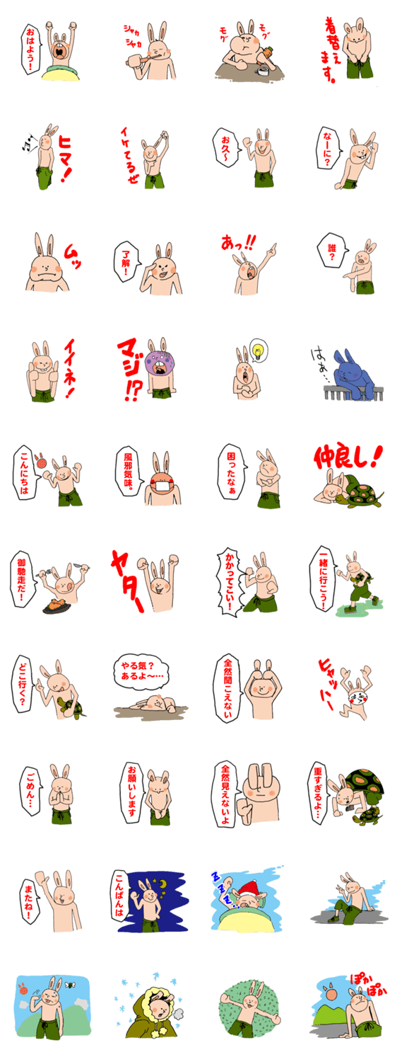 ノーテンキうさぎ K.カエル コメントをどうぞ 能天気なうさぎのキャラクター「ノーテンキうさぎ」です。 このスタンプどう思う?!↓クリックで投票♪好き (0)かわいい (0)かっこいい (0)おもしろい (0)使いやすそう (0)欲しい (0)萌え (0)ほっこりする (0)おしゃれ (0)ゆるい (0)こわい (0)ウザい (0)キモい (0)ムカつく (0)持ってる (0)癒される (0)セクシー (0)個性的 (0)私は買わない (0)誰かプレゼントして! (0) 購入・プレゼントする Facebookでシェア Twitterでシェア