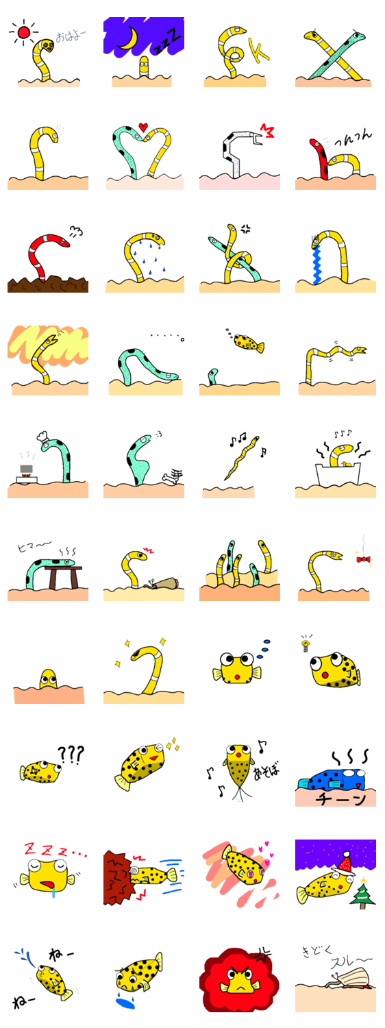 ハコフグとチンアナゴの楽しいアクアリウム だいちょ コメントをどうぞ 作者が飼育している、ミナミハコフグとチンアナゴの表情豊かなアクアリウム生活をスタンプにしました。 このスタンプどう思う?!↓クリックで投票♪好き (0)かわいい (0)かっこいい (0)おもしろい (0)使いやすそう (0)欲しい (0)萌え (0)ほっこりする (0)おしゃれ (0)ゆるい (0)こわい (0)ウザい (0)キモい (0)ムカつく (0)持ってる (0)癒される (0)セクシー (0)個性的 (0)私は買わない (0)誰かプレゼントして! (0) 購入・プレゼントする Facebookでシェア Twitterでシェア
