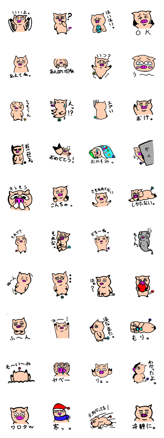 ハナブタ ハナブタ コメントをどうぞ なんとも言えない表情をしたブタのスタンプです。尻尾の花の色は気分によって変わるのが特徴です。会話にちょっぴり脱力感を出し、ほっこりします。 このスタンプどう思う?!↓クリックで投票♪好き (0)かわいい (0)かっこいい (0)おもしろい (0)使いやすそう (0)欲しい (0)萌え (0)ほっこりする (0)おしゃれ (0)ゆるい (0)こわい (0)ウザい (0)キモい (0)ムカつく (0)持ってる (0)癒される (0)セクシー (0)個性的 (0)私は買わない (0)誰かプレゼントして! (0) 購入・プレゼントする Facebookでシェア Twitterでシェア