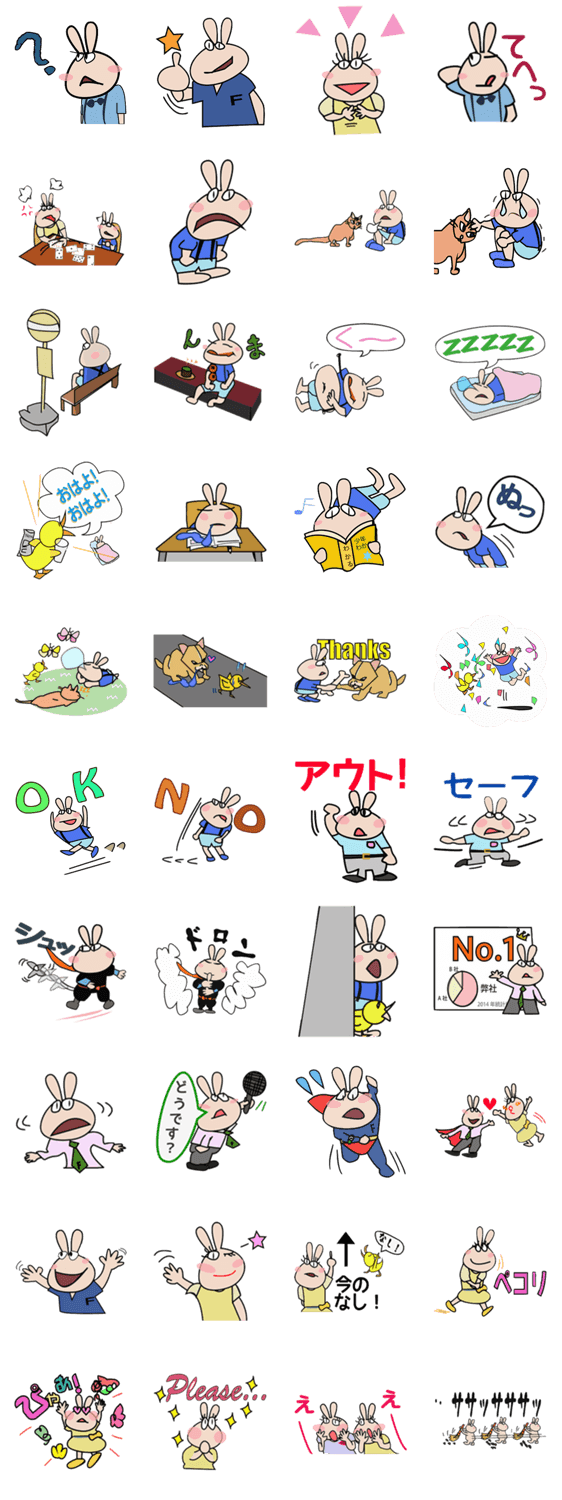 バカうさ キャラクターズドット コメントをどうぞ 仕事熱心な父、キャピキャピな母、ペットの鳥、そして息子のバカうさ。「うさぎのマーフィー家」のかわいいキャラクターたちのスタンプは、普段の会話使いにピッタリ☆ このスタンプどう思う?!↓クリックで投票♪好き (0)かわいい (0)かっこいい (0)おもしろい (0)使いやすそう (0)欲しい (0)萌え (0)ほっこりする (0)おしゃれ (0)ゆるい (0)こわい (0)ウザい (0)キモい (0)ムカつく (0)持ってる (0)癒される (0)セクシー (0)個性的 (0)私は買わない (0)誰かプレゼントして! (0) 購入・プレゼントする Facebookでシェア Twitterでシェア