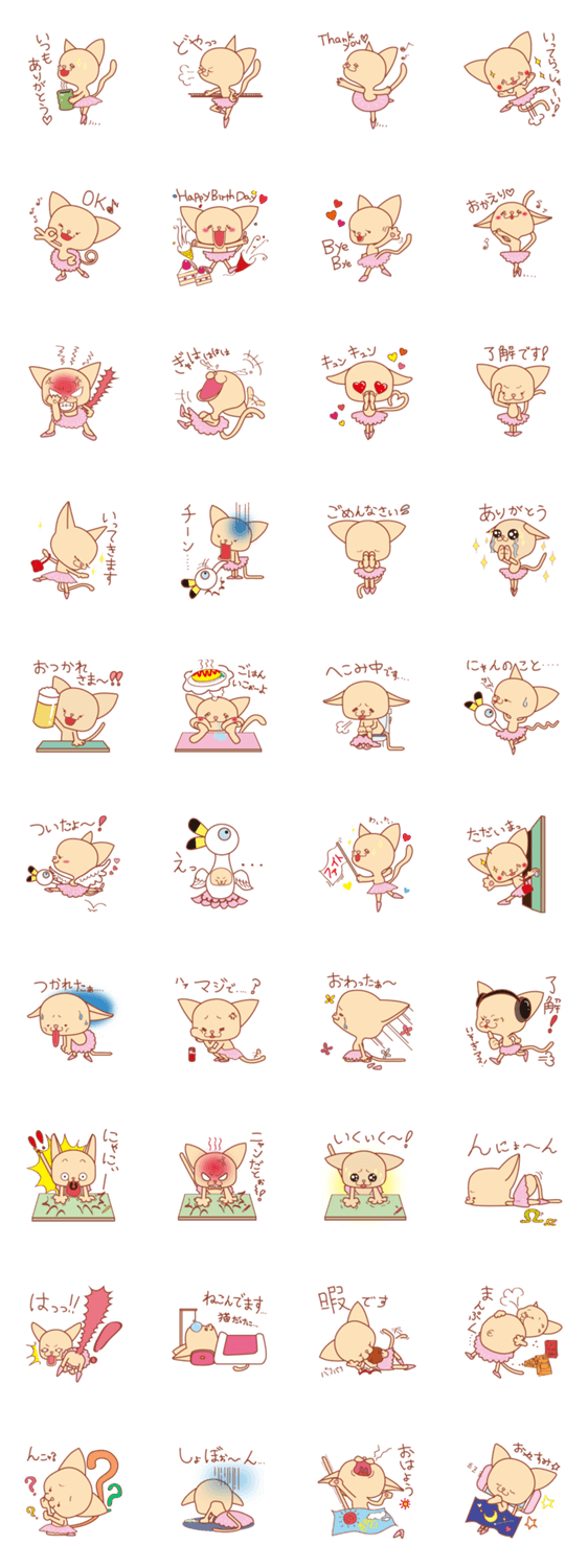 バレリーナ猫 〈 バレリーにゃ 〉 竜雅 コメントをどうぞ 名前はにゃーこ。バレリーナに憧れを抱いている夢がたっぷりの猫。まだ本物になる日は程遠いのが現実です。心の優しい性格だが純粋ゆえに態度がすぐ表に出てします。 このスタンプどう思う?!↓クリックで投票♪好き (0)かわいい (0)かっこいい (0)おもしろい (0)使いやすそう (0)欲しい (0)萌え (0)ほっこりする (0)おしゃれ (0)ゆるい (0)こわい (0)ウザい (0)キモい (0)ムカつく (0)持ってる (0)癒される (0)セクシー (0)個性的 (0)私は買わない (0)誰かプレゼントして! (0) 購入・プレゼントする Facebookでシェア Twitterでシェア