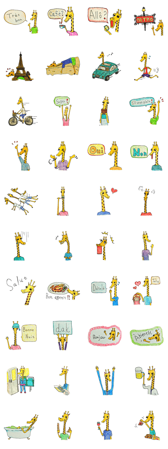 パリ生活のジラフ君 ayako コメントをどうぞ フランス、パリ在住のキリンさん。アンニュイでお洒落な彼の日常が、優しい手描き風スタンプになりました。世界中どこにいても、彼と一緒にパリ生活が楽しめます。 このスタンプどう思う?!↓クリックで投票♪好き (0)かわいい (0)かっこいい (0)おもしろい (0)使いやすそう (0)欲しい (0)萌え (0)ほっこりする (0)おしゃれ (0)ゆるい (0)こわい (0)ウザい (0)キモい (0)ムカつく (0)持ってる (0)癒される (0)セクシー (0)個性的 (0)私は買わない (0)誰かプレゼントして! (0) 購入・プレゼントする Facebookでシェア Twitterでシェア